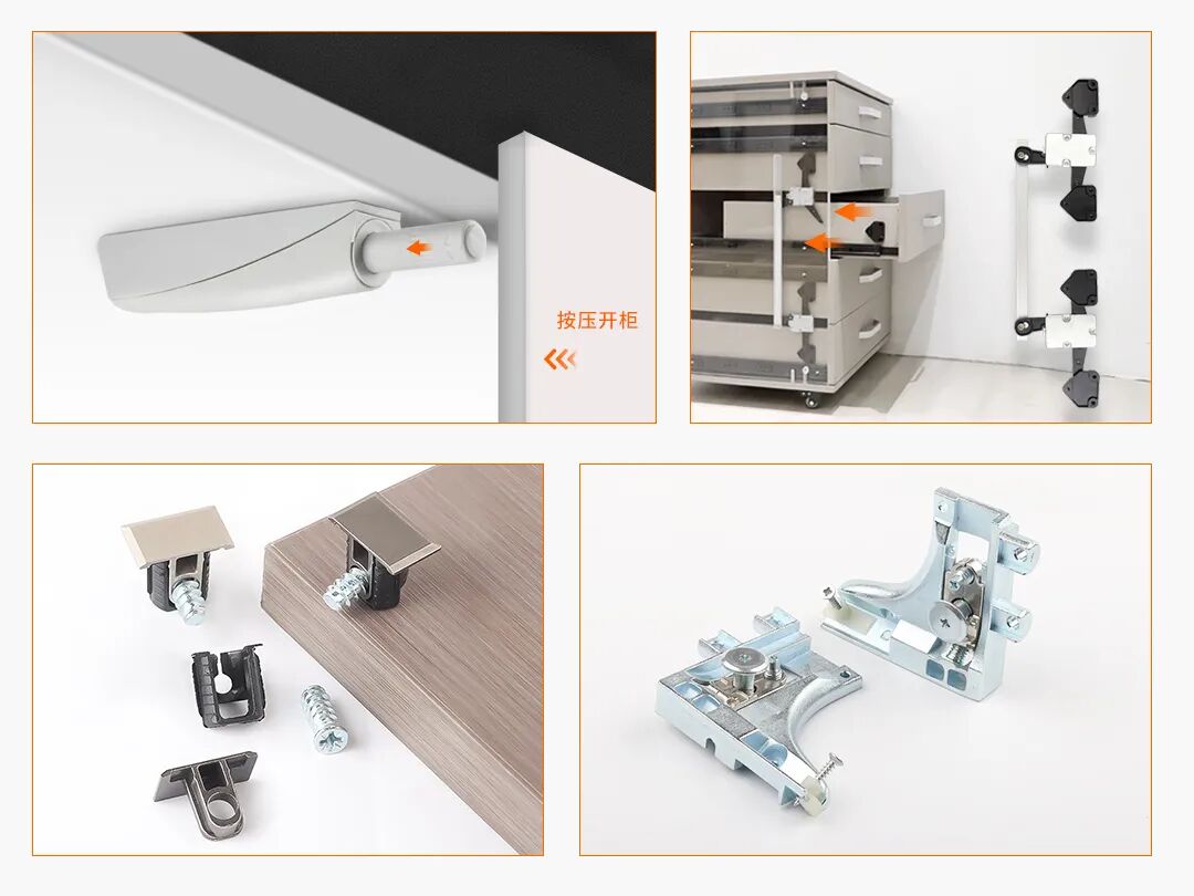 还有各类多功能抽屉互锁防倾倒配件、折叠登高梯、智能折叠凳等多功能五金和精品层板托、拉直器、调节脚、吊码等小五金产品。