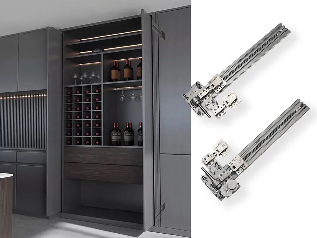 适合高档酒柜的回旋门五金系统,单门承重高达80kg、模块化快捷安装;阻尼式上翻插门配件,能使门板收入顶板下,便于收纳图书杂志;快装内吊试趟门配件,更便于居家日常清洁清扫。