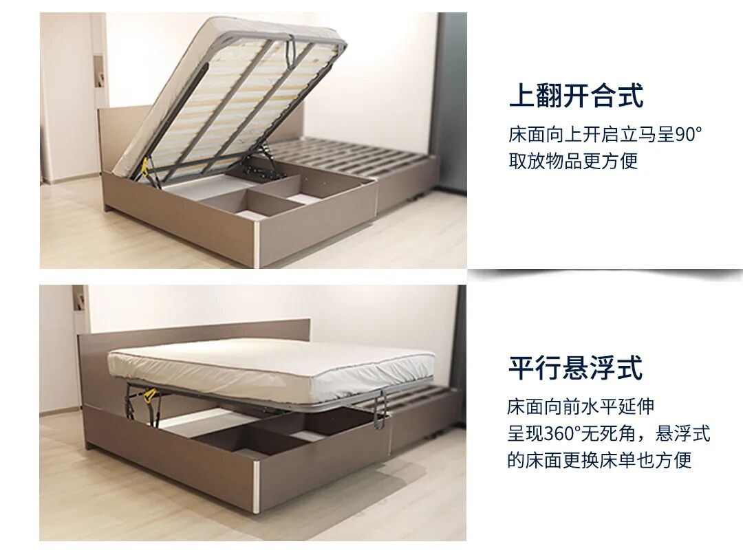 折叠隐形床机构配件和床箱收纳支撑、开合轻便、稳定安全,省空间、增加活动或储物空间,更便于房间的日常打理。