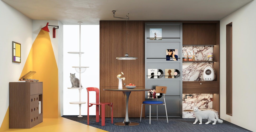 “我和毛孩子的双向治愈乐园”是一个中古包豪斯风格的场景,为家有爱宠的人士打造的,设计师心中的“我”、“毛孩子”通过不同的收纳功能模块进行需求实现。