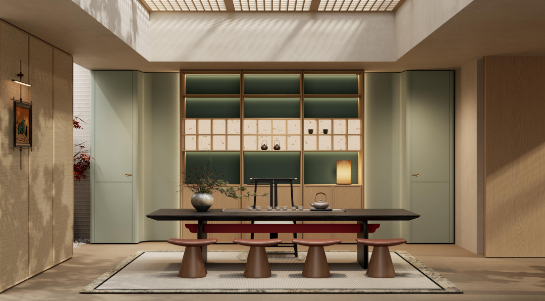 茶室部分由两个模块构成,包括煮茶工具收纳模块和茶叶茶罐收纳陈列模块,宋式淡雅生活方式用柔光秘瓷青非遗烤漆色成为点睛之笔。