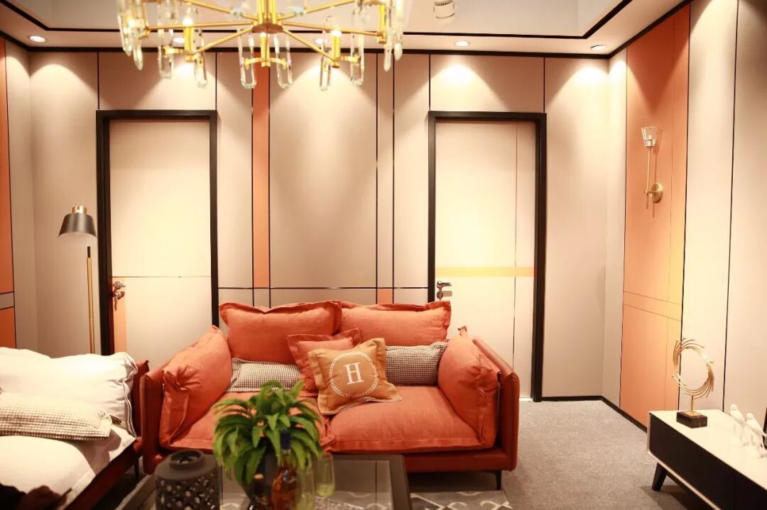 在W1馆里比较具有特色的品牌之一,德木轩是陕西西安的定制品牌,本次以集装箱形式承载了主要的展品,据其工作人员介绍虽然看上去投资非常巨大,但是其拆装也非常便利,并且可以多次应用,其实是非常省钱的参展方式。就产品而言,德木轩定位高端,多个实木整装场景均获得大量观众认可。