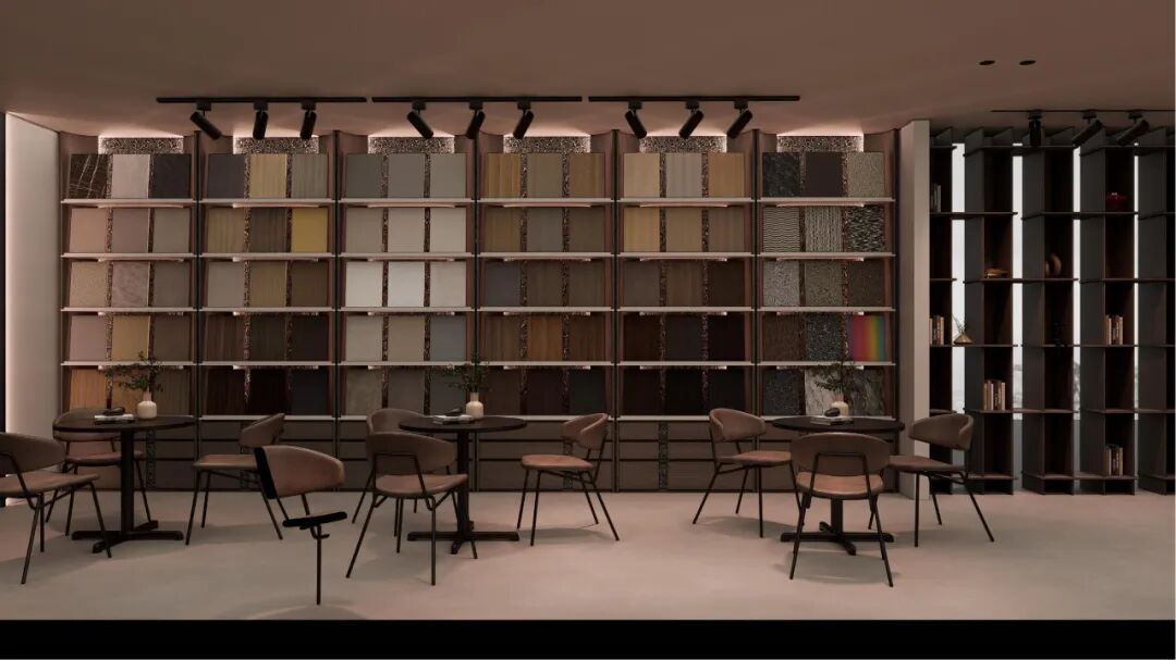 德琅本次的“宋韵雅集”展厅,共有八个场景,分别为:入口实木屏风、客厅、书房、衣帽间、茶室、玄关、洽谈区和小样展示区等。