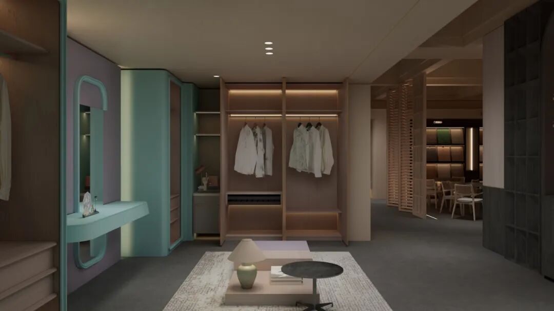 后面的衣帽间、茶室空间、玄关、洽谈区和小样展示区更是把德琅的“轻奢自然”表现的淋淋尽致,大胆的用色和材质设计,把“传统元素与现代设计”完美结合。