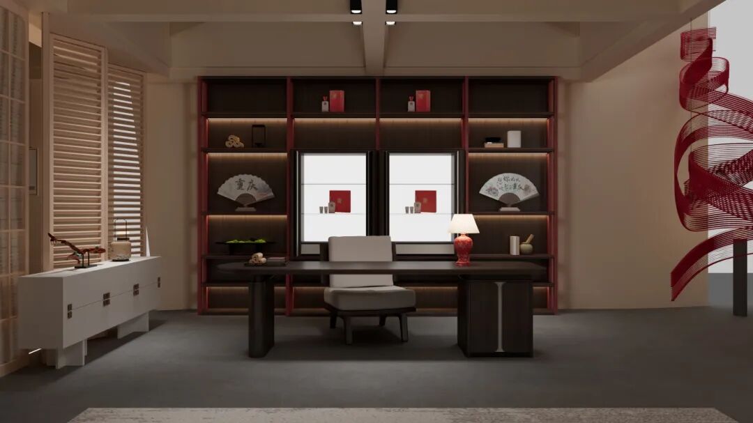 书房空间的设计中,设计师选择简化传统中式符号,并借书架、文房器物等元素,植入“书香雅静”的中式办公意境;