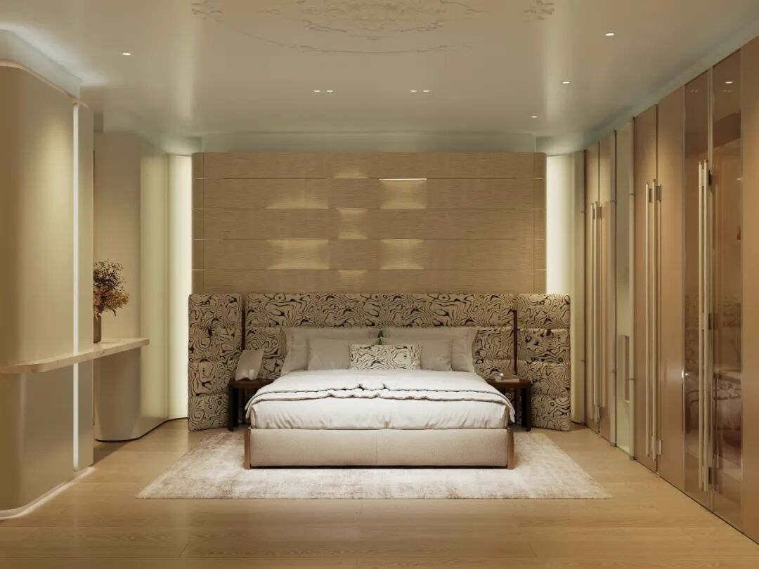 卧室空间摒弃主灯,采用多元照明组合,营造温暖氛围;沉稳色调+高质感触感材质,搭配极简家具线条,演绎高级感十足的舒适休憩空间。